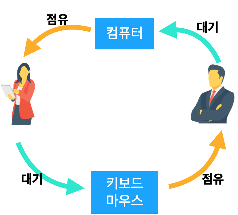 프로세스는 한번에 하나의 자원만 사용 할 수 있다. 사용 중인자원을 다른 프로세스가 사용하기 위해서는 사용중인 자원이 해제될 때까지 기다려야 한다.