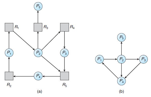 교착 상태 탐지 를 위한 방법으로 자원할당 그래프 소거 방법 을 사용하여 순환여부 확인합니다.