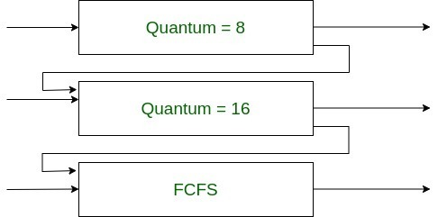 그림에서 상위 2개의 큐는 각각 할당시간(Quantum)이 8과 16인 라운드 로빈 스케줄링을 사용한다. 세번 째 큐는 FCFS 스케줄링 기법을 사용한다.