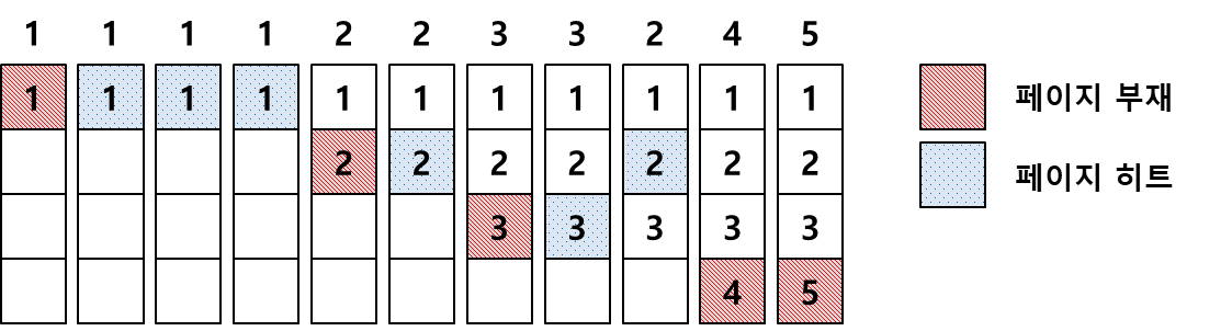 10번의 페이지 부재와 2번의 페이지 히트가 발생했습니다.