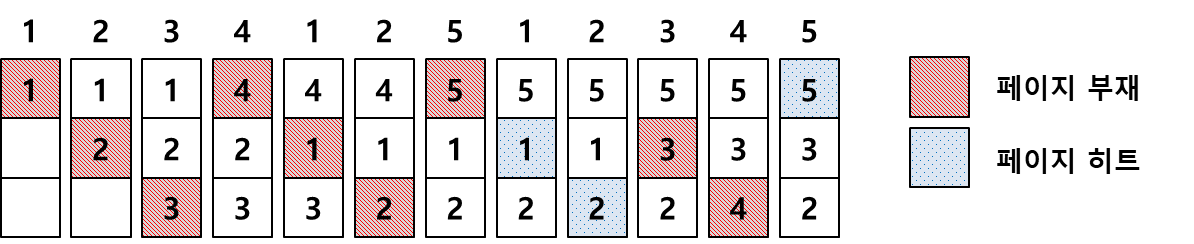 아래 그림은 3개의 페이지 프레임을 가질 경우 9번의 페이지 부재와 3번의 페이지 히트가 발생했습니다.