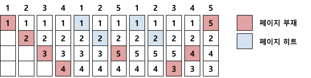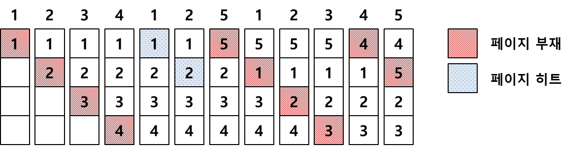 LRU 알고리즘을 사용하니 8번의 페이지 부재와 4번의 페이지 히트가 발생했습니다. FIFO 알고리즘에 비해 페이지 부재 횟수가 감소 했음을 알 수 있습니다.