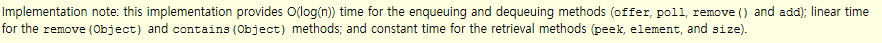 시간 복잡도 메서드 O(log(n)) offer, poll, remove, add O(n) remove O(1) peek, element, size
