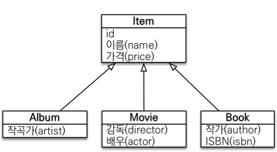@Entity @Getter @Setter @DiscriminatorValue(value = "A") public class Album extends Item{ private String artist; } @Entity @Getter @Setter @DiscriminatorValue(value = "B") public class Book extends Item{ private String author; private String isbn; } @Entity @Getter @Setter @DiscriminatorValue(value = "M") public class Movie extends Item{ private String director; private String actor; }