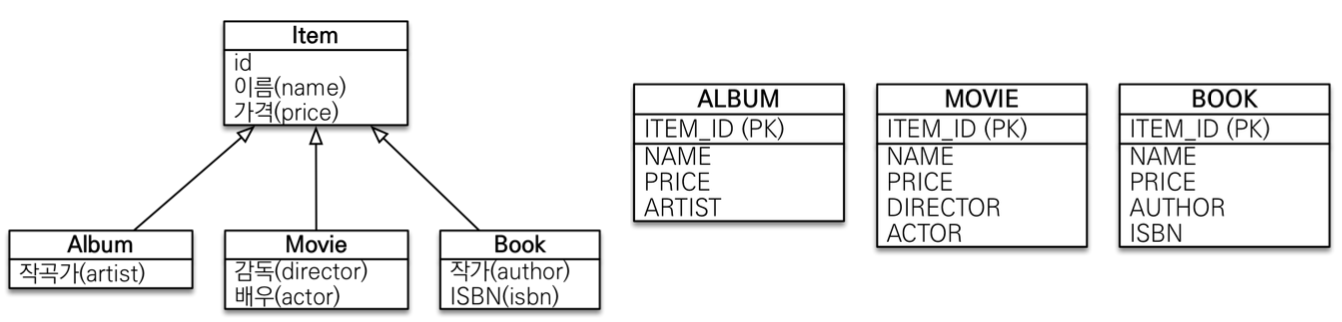 JOINED 전략과 유사하지만 슈퍼타입(여기서는 Item) 칼럼들을 서브타입으로 내리는 전략입니다. 각각의 구현 클래스마다 테이블 생성 전략을 적용 할 수 있으며, NOT NULL 제약조건을 사용할 수 있습니다.