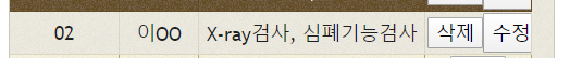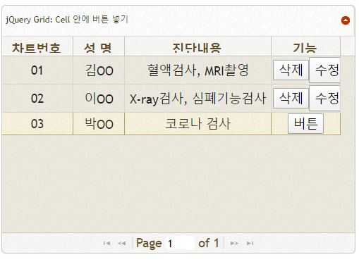var dataArr = [ {NO:"01",Name:"김OO", content:"혈액검사, MRI촬영",btn:Btn()}, {NO:"02",Name:"이OO", content:"X-ray검사, 심폐기능검사",btn:Btn()}, {NO:"03",Name:"박OO", content:"코로나 검사",btn:"<button>버튼</button>"}, ];var Btn = function(){ return '<button onclick="alert(\'삭제하다\');">삭제</button>'+ '<input type="button" value="수정" onclick="alert(\'수정하다\');">'; }$(function(){ $("#jqGrid").jqGrid({ datatype: "local", data: dataArr, height: 250, width: 500, colNames : ['차트번호','성 명','진단내용','기능'], colModel:[ {name:"NO", index:"NO", width : 70, align:'center', hidden:false }, {name : 'Name', index : 'Name', width : 50, align : 'center', hidden:false, }, {name : 'content', index : 'content', width : 150, align : 'center', hidden:false }, {name : 'btn', index : 'btn', width : 70, resizable : true, align : 'center', hidden:false }], loadtext: "로딩중입니다.", caption: "jQuery Grid: Cell 안에 버튼 넣기", pager:"#gridpager", }); });코드설명