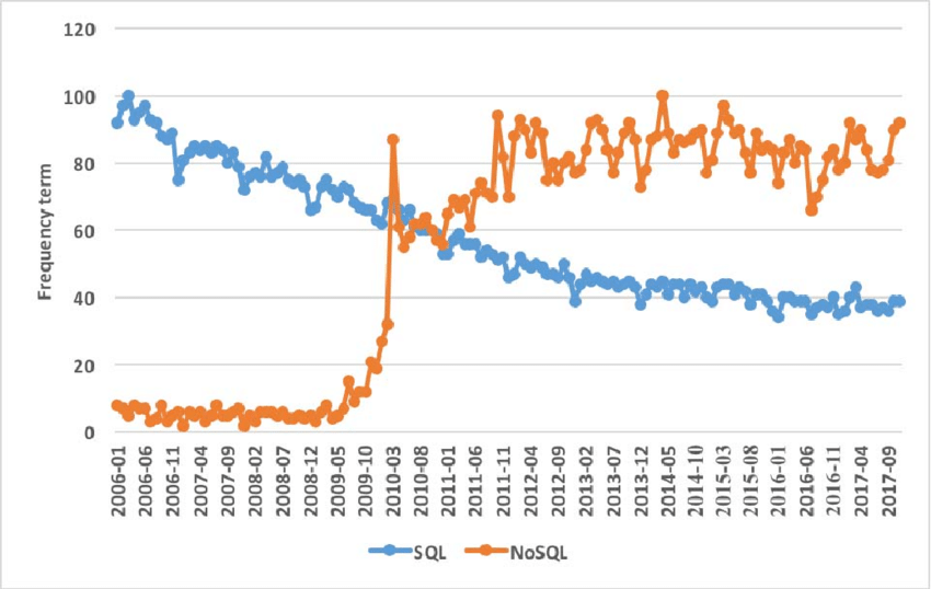 <researchgate.net> Google trends using NoSQL versus SQL terms 그래프를 보면 2009년을 기점으로 NoSQL이 SQL을 추월하여 사용되고 있는 것과 SQL이 점점 하향세를 타고 있음을 알 수가 있습니다. 이렇게 많이 사용되고 있지만 개발자인 제가 정작 NoSQL이 무엇이지 모르고 있다는 사실이 참 부끄러워지네요,, ㅠㅠ
